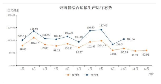 2025年10月云南省综合运输生产态势平稳增长,TDMI为106.34,环比增加6.29%,同比增加8.20%。国庆、中秋假期带动效应明显,叠加秋冬旅游季开启,旅客出行需求阶段性集中释放,综合客运全面回暖;随着“双十一”电商节备货启动、制造业旺季延续以及跨境物流持续活跃,综合货运需求稳步增强。