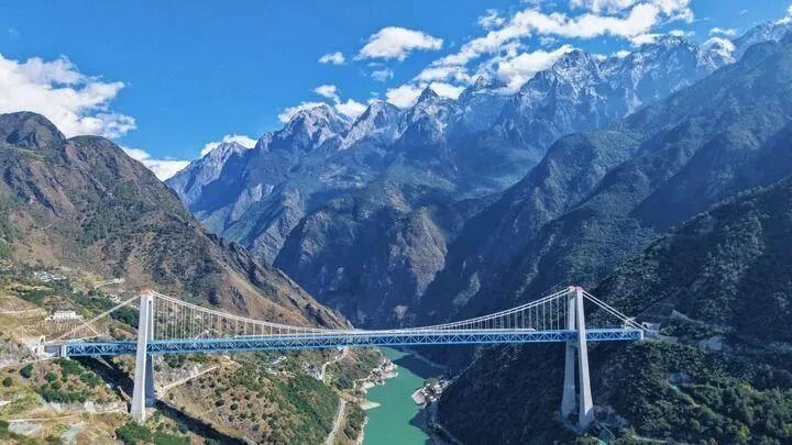 这是全长882.5米的虎跳峡金沙江铁路大桥。大桥起于玉龙雪山隧道出口,止于哈巴雪山隧道进口,是丽香铁路的重点控制性工程(2025年11月21日摄,无人机照片)。新华社发(杨紫轩摄)