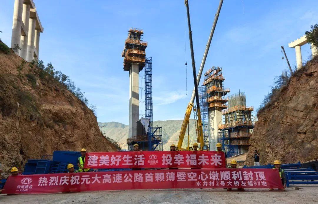 4月22日,元大高速项目水井村2号大桥左幅9#空心薄壁墩墩身顺利封顶,这是全线首个完成封顶的空心薄壁高墩。