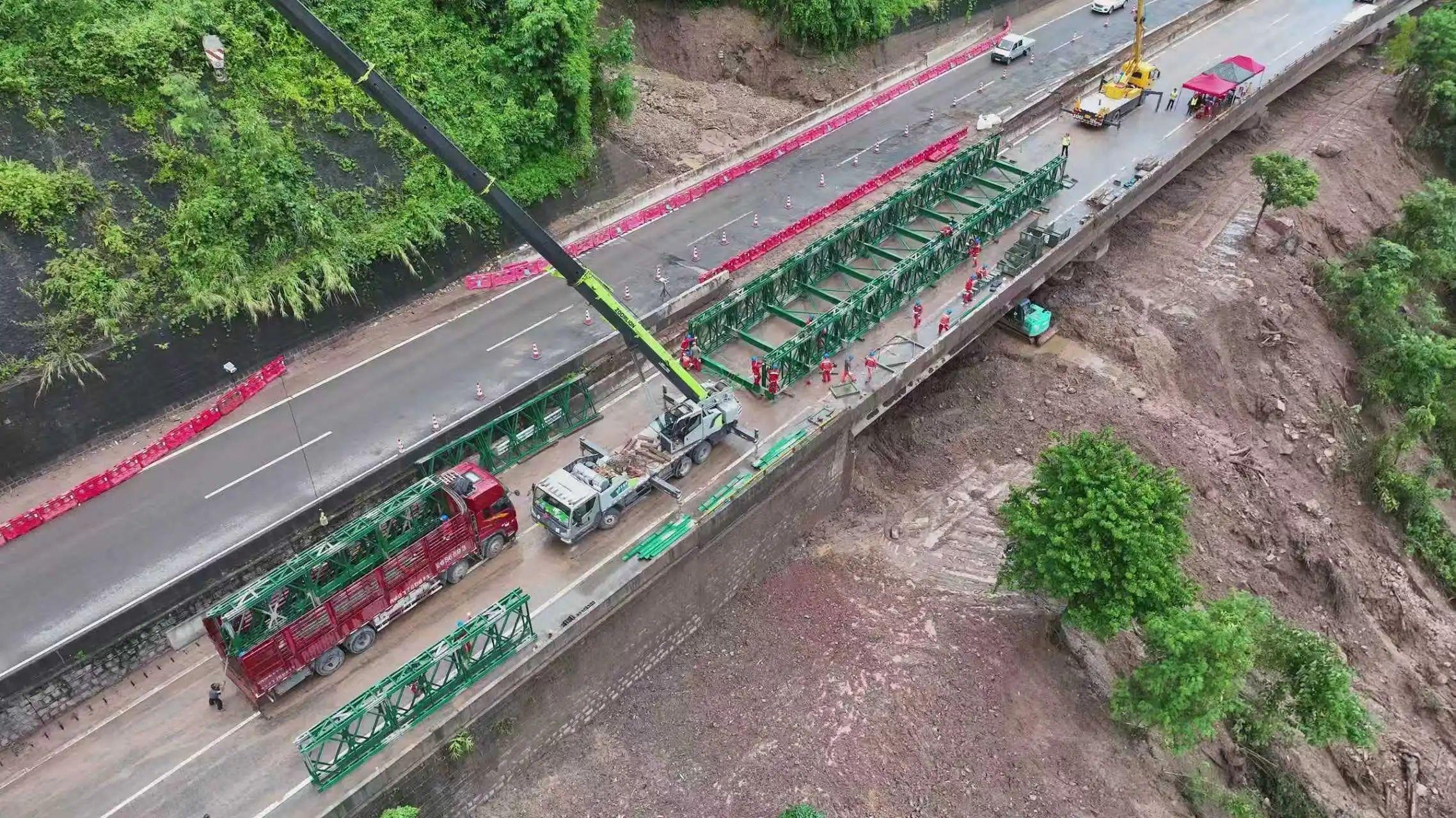 为加快架设进度,确保公路尽早恢复通行,现场采用“两班倒”作业模式,架桥作业一刻不停持续推进。