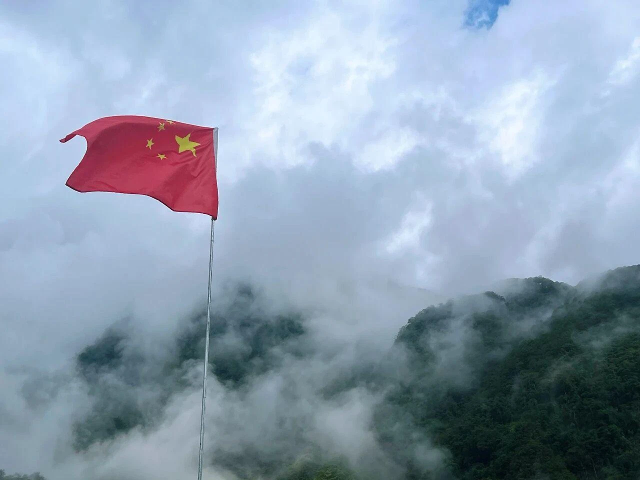 她用手机记录下这样一幅画面:背倚青山的独龙族民居沿山坡而筑,每家每户院内高扬的五星红旗顺山势延伸,大风一过,红旗漫卷直向白云升处。