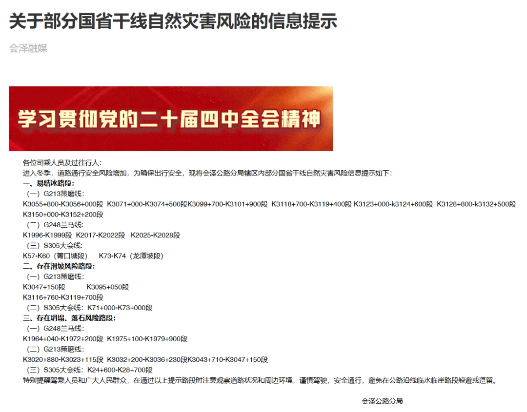 迪庆公路局在重点路段规范设置安全警示标志牌,提醒过往车辆。会泽公路分局绘制“两张清单”。其中,“易积雪结冰高风险路段清单”排查统计14段易积雪结冰路段并通过会泽县融媒体向社会发布,让公众提前知晓、规避风险,以透明化举措筑牢出行安全屏障。