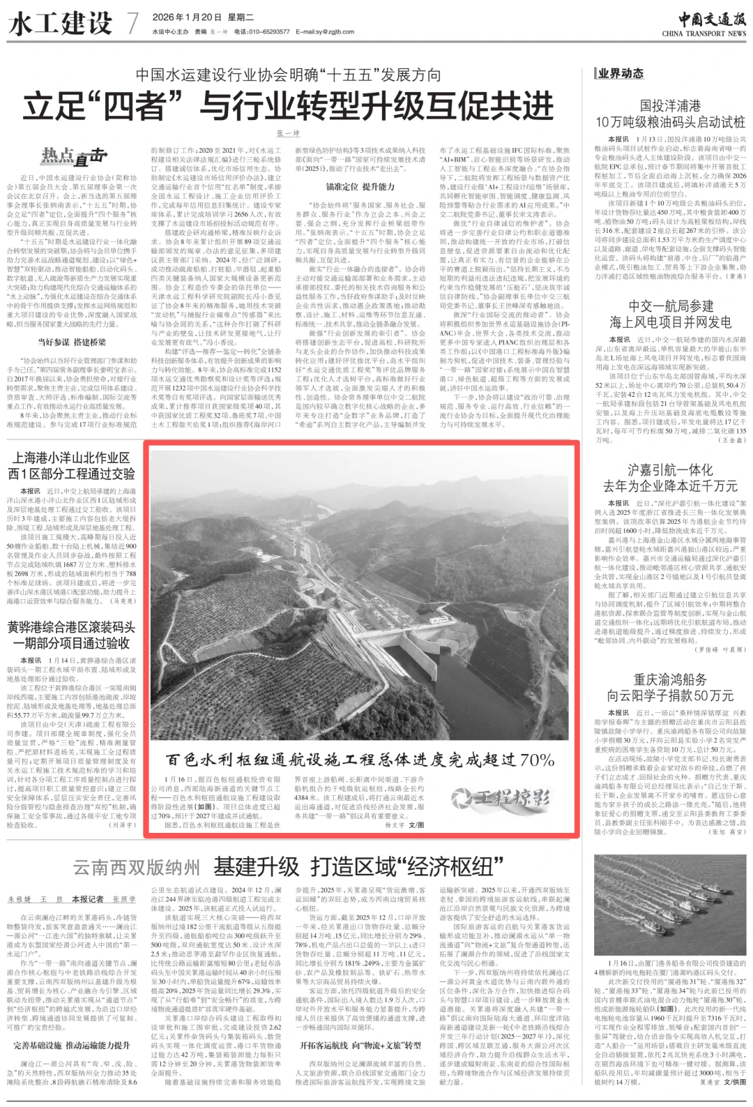 1月20日,《中国交通报》刊发文章《百色水利枢纽通航设施工程总体进度完成超过70%》,全文如下: